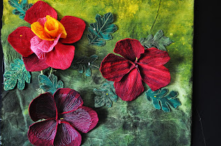 From there, I experienced a huge growth spurt and soon began to find my way, making nature inspired art quilts. My very first real intentional art quilt was Little Boy Blue. This piece was created in 2007 out of commercial and hand dyed fabrics, tyvek, dyed cheesecloth and fibers; inked and painted, heat distressed, machine appliquéd and quilted. Yep, by this time, I was totally inspired by learning to hand dye and heat distress fabrics, So cool!!!! And so, was falling in love with texture all over again! Seven years later, I found myself returning to teaching, creating art, sharing my work in various venues, museums and galleries, judging art/quilt shows and having a wonderful time. I absolutely love the art of quilting and wouldn't change a minute of it! Today, I work primarily in both abstract and nature inspired themes, primarily focusing on texture and 3 dimensional aspects. I am currently writing an article for Quilting Arts magazine regarding my 3 Dimensional flowers. Stay tuned for the December?January 2013 issue where I will be sharing some insight as to how I make my 3D flowers. For now, I am currently working on a teaser.